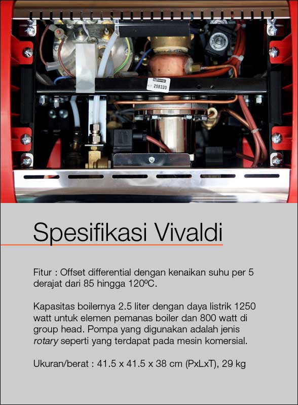 Terlepas dari ukuran portafilter-nya yang berdiameter 53cm, yang menurut saya justru merupakan kelebihannya, Vivaldi adalah sebuah mesin espresso yang begitu toleran hingga cukup mudah digunakan. Sedikit over dose, tamping agak miring, misalnya, buat Vivaldi hal tersebut bukanlah dosa besar dan tak terampuni. Apalagi portafilter-nya yang single sangat membantu menghemat kopi karena biasanya pada yang berdiameter 58mm, agak sulit menghasilkan shot yang bagus, setidaknya buat saya. Cocok dengan namanya Vivaldi, sebagaimana nama komposer Baroque yang hasil karyanya tidak njlimet dan mudah untuk dinikmati bagi siapapun yang awam dengan musik klasik.