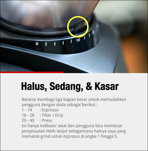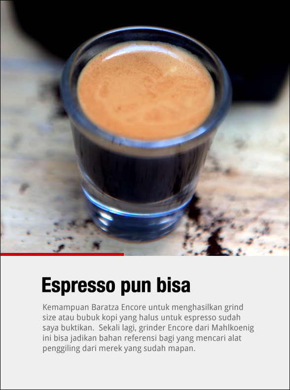 Bagi saya, indikator awal sebuah grinder yang baik adalah kemudahan melakukan perubahan setting dan tentu saja grind size yang secara kasat mata tampak rata atau konsisten. Salah satu caranya adalah langsung menggunakannya untuk espresso karena bubuk kopinya ditutut lebih halus dan seragam agar kucuran kopinya bisa menghasilkan crema dengan warna goden brownish.