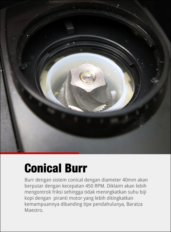 Image 4: The conical system burr with 40mm diameter will spin to a speed of 450 RPM. Claimed to have a better friction control so as not to increase the temperature of the coffee beans with a motor tool which is better enhanced than its predecessor types, Baratza Maestro.