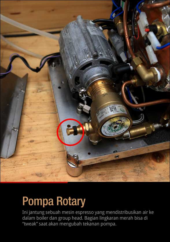 Pressure Adjustment : Tapi tahan dulu, bila Anda ingin melakukan pressure adjustment ini saatnya yakni mengubah parameter tekanan boiler dan pompa dengan melakukan test terlebih dahulu menggunakan blind filter. Lihat tekanan pompa dan boiler yang ditunjukan pada kedua manometer sambil mengangkat tuas brewing. Proses ini saya lakukan dengan membuka cover hingga bisa mengakses kedua bagian tersebut, yakni pada pompa dan P-Stats. Hanya tekanan pompa yang kami ubah menjadi 9 bar, angka moderat yang biasanya tokcer untuk ekstraksi espresso pada mesin rumahan. Terima kasih kepada Andy Kho yang sudah berbaik hati berbagi ilmu home barista-nya saat melakukan tweak pada mesin V3.