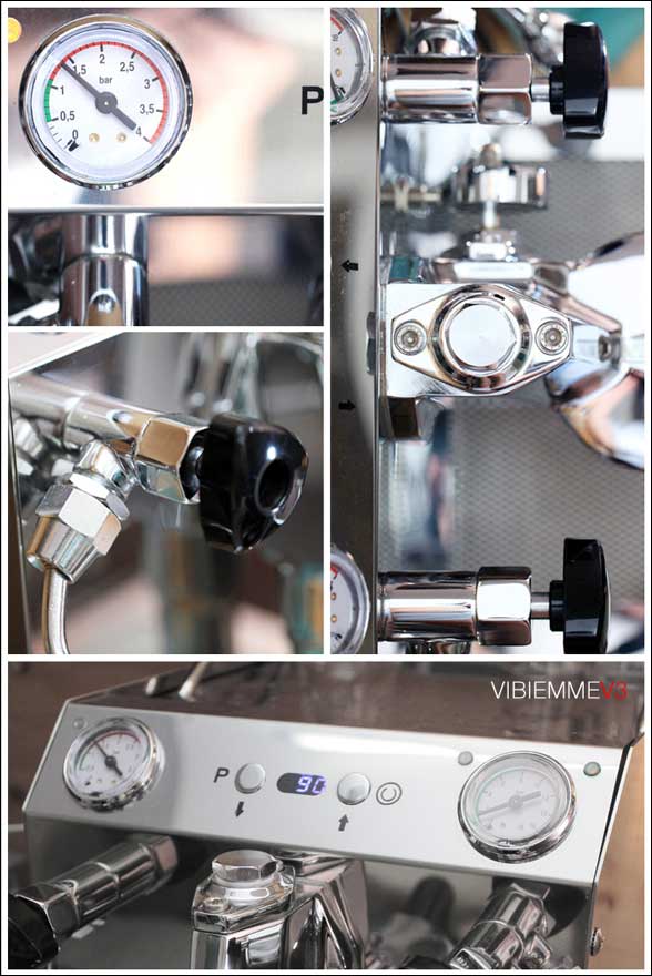Panel depan : Dua manometer yang menunjukan indikator tekanan boiler (kiri) dan pompa (kanan) adalah hal penting yang harus diperhatikan setiap melakukan brewing. Buku petunjuk tidak memberikan berapa besar tekanan pompa dan boiler, tapi pada mesin yang saya miliki dulu, 8.6 hingga 9.2 bar adalah angka aman yang dianjurkan oleh pabrikan untuk tekanan pompa.
