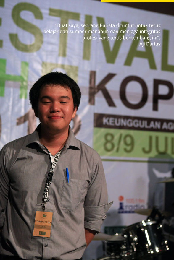 Aji Darius (25) dari Roswell Coffee Bandung baru saja mengukuhkan dirinya sebagai juara Barista dalam acara Pameran Teh dan Kopi di kota Bandung, 8-9 Juli kemarin. Menyisihkan 11 peserta lainnya, Aji berhak mengantungi hadiah uang tunai sebesar 5 juta rupiah berikut paket perjalanan ke Italia melihat pabrikan La Marzocco. Aji hanya punya persiapan beberapa hari dan harus ngebut mempersiapkan penampilannya terutama racikan signature drink yang ia kembangkan dari resep ciptaannya sendiri dan berhasil mengumpulkan poin tertinggi dan menjadi juara event ini.
