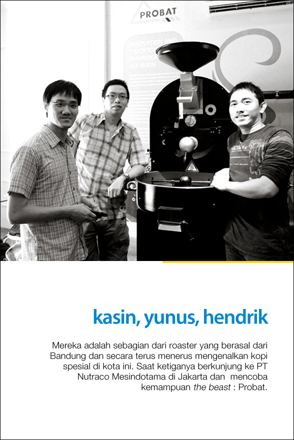 Kami menempuh perjalanan menuju arah Lembang dari jalan Dokter Setiabudi dan mengarahkan kendaraan ke arah kiri menuju sebuah komplek perumahan. Di rumahnya yang luas, Kasin menempatkan mesin roasting buatan dalam negeri dengan kapasitas 3 kilogram di ruang tamu yang ia jadikan sebagai basis produksi. “Mesinnya cukup baik, walau buatan dalam negeri, sayang kapasitasnya masih kecil” sembari menuangkan 3 kilogram kopi Jawa pesanan salah satu pelanggannya.
