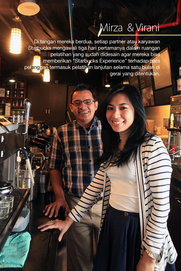 Virani dan Mirza secara terus menerus memfasilitasi metode “Train the Trainer”, misalnya Store Manager yang sudah tersertifikasi akan menjadi pelatih para partner baru, sekaligus sebagai bagian pengembangan karir bagi mereka. Setelah tiga hari menamatkan pendidikan di Support Center, para partner akan langsung diterjunkan ke gerai Starbucks namun mereka akan mengikuti pelatihan lanjutan (in store learning) selama satu bulan yang didampingi oleh buddy atau learning coach masing-masing.