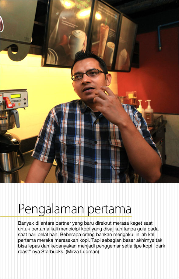 Direktur pun wajib. Juga saat pertama partner memulai hari pertamanya di gerai Strabucks, mereka akan disambut oleh Store Manager yang memberikan penjelasan tentang detail pekerjaan hingga pernik kecil seperti lokasi toilet, tempat istirahat atau makan. Buat Starbucks, kesan pertama teramat penting agar setiap partner merasa nyaman dalam melakukan tugasnya sembari memberikan dukungan penuh kepada mereka termasuk pengembangan karirnya.