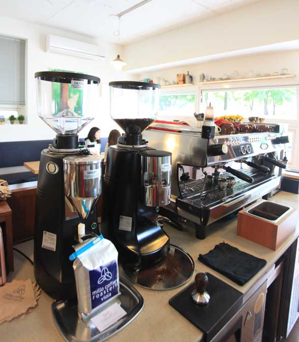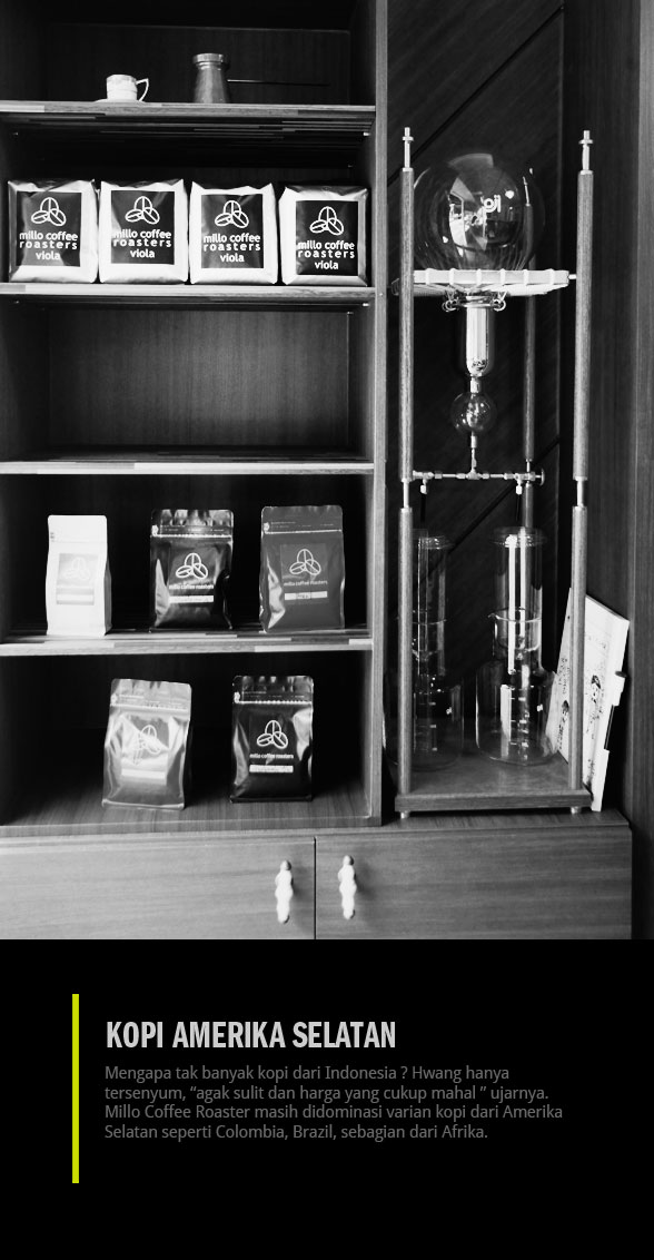 Hwang, Don Gu, pemilik sekaligus pengelola Millo tengah sibuk melayani pengunjung yang lain saat saya memasuki cafe-nya. Sayang ia tak bisa berbahasa Inggris, namun tentu menyambut kedatangan kami dan segera menyiapkan pesanan yang ia rekomendasikan dari menunya. Mesin roasting merek Jerman yang terkenal itu menjadi bagian tak terpisahkan di Millo dengan balutan warna emas pada drum-nya. Hwang mengkonfirmasi pertanyaan saya bahwa mesin goreng kopinya berkapasitas 5 kilogram walau sayangnya ia baru saja menyelesaikan kegiatan roasting untuk hari itu.