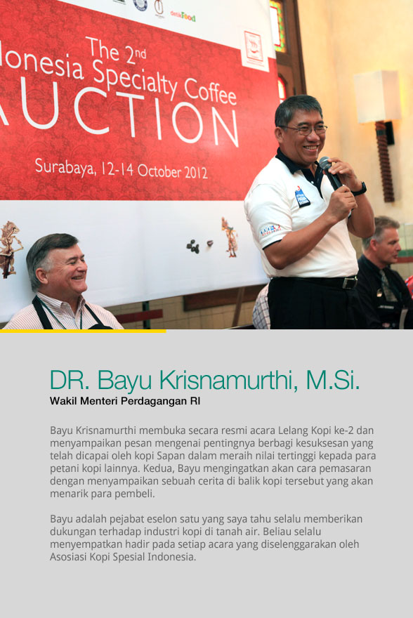Acara Lelang dibuka oleh Wakil Menteri Perdagangan DR. Bayu Krisnamurthi, M.Si. seorang pejabat tinggi yang selalu hadir pada setiap acara penting dan memberikan dukungan bagi kemajuan industri kopi di tanah air (twitter @bayukr). Menurut data ekspor, Bayu menyebut angka 10% dari 650 ribu ton ekspor tahunan kopi nasional yang dikategorikan sebagai kopi spesial. Ia membisiki para peserta agar pandai-pandai mengemas cerita dibalik kopi yang dijual sebagai salah satu cara atau strategi pemasaran. Poin penting lain yang ia sampaikan adalah berbagi ilmu kepada petani lainnya untuk dapat mengikuti jejak yang telah diperoleh kopi Sapan dengan hasil penilan cupping score tertinggi untuk varian arabika.