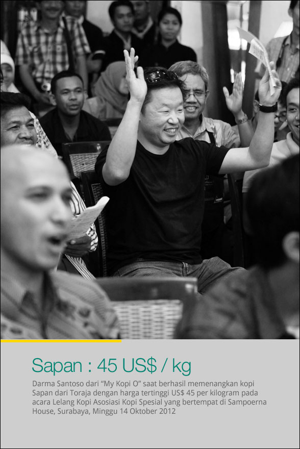 Di sore itu, Minggu 14 Oktober, sebuah catatan penting ditorehkan oleh kopi Toraja Sapan yang terjual di angka US$ 45 per kilogram, sekaligus memecahkan rekor harga tertinggi di Lelang Kopi ke-2 yang berlangsung di Samporna House, Surabaya. Pembelinya bukan dari luar negeri, tapi Darma Santoso (43 tahun) , pemilik 27 restoran dan cafe di berbagai kota di Indonesia, salah satunya adalah jaringan cafe My Kopi O. “Kopi terbaik ini harus tetap berada di Indonesia” kata Darma seusai acara Lelang. Sebuah klimaks dalam keriuhan Lelang kopi ke-2 yang dihadiri oleh para pembeli luar dan dalam negeri untuk memperebutkan 23 kopi terbaik di Indonesia. Peraihan harga tertinggi kopi Sapan menurut DR. Surip Mawardi peneliti utama dari ICCRI yang juga hadir pada acara kemarin sebagai “judge” akan mengirimkan pesan penting khususnya kepada para petani kopi Indonesia untuk terus menerus meningkatkan kualitas produksinya.