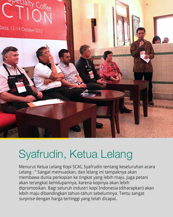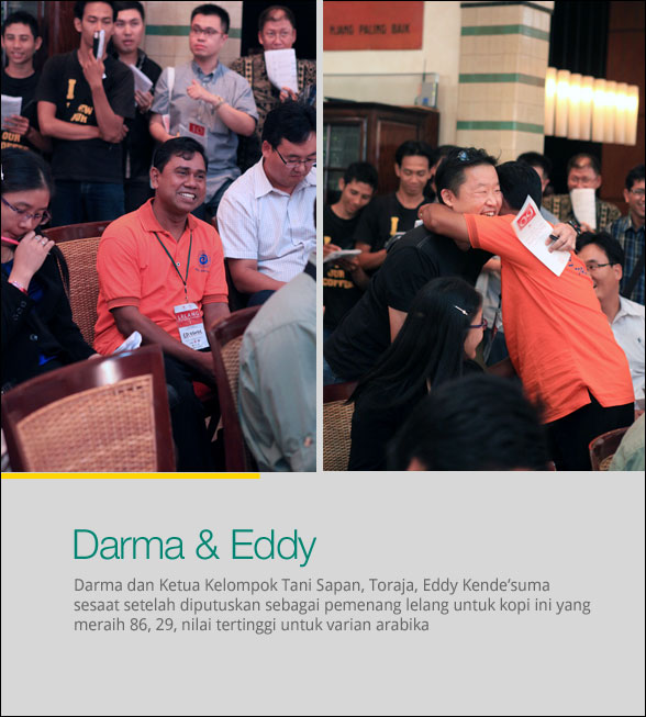 Sebagai catatan, pada saat acara Lelang kopi di Bali tahun 2010, kopi Atu Lintang dihargai 10.5 US$ per kilogram yang diboyong ke Amerika Serikat sebanyak 600 kilogram. Di Surabaya pada Lelang ke-2 kemarin, kopi Sapan Toraja membukukan kenaikan fantastis sebanyak 4 kali dan membuat ruangan Sampoerna House menjadi tempat bersejarah saat kopi Indonesia diberikan penghargaan sangat tinggi, bukan oleh pembeli dari luar, tapi arek Surabaya, Darma Santoso yang terus mengacungkan kerta bidding dan harus bersaing keras dengan Steven Kil, pembeli dari Korea Selatan yang juga berminat dengan kopi dari wilayah Indonesia Timur ini. Harga terus merangkak sejak penawaran awal sebesar US$ 25/kg, dan semakin menggila hingga tak ada lagi bider yang berani melawan Darma yang memasang angka di 45 dolar per kilogram “it’s SOLD” kata Rocky Rhodes dan tepuk tangan panjang pun bergema. Sebuah momen maha langka manakala kopi Indonesia terbaik menjadi tuan rumah di negaranya sendiri.