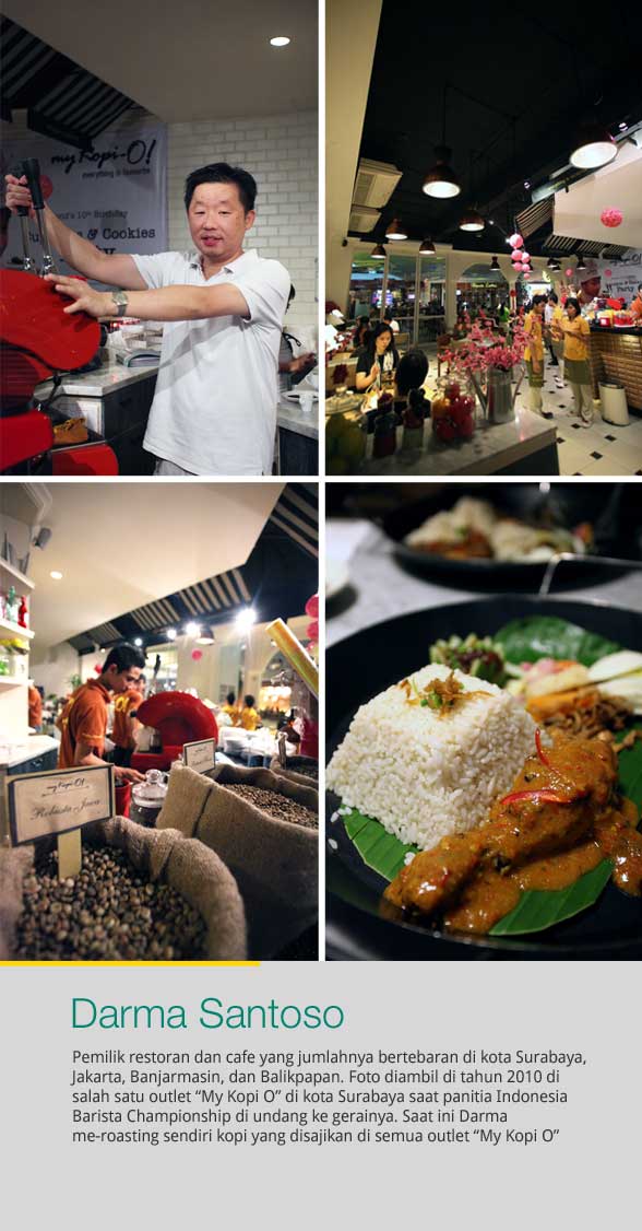 Bagi Anda yang belum mengenal Darma Santoso beliau adalah pebisnis yang memiliki puluhan restoran serta cafe yang telah beranak pinak dari Surabaya, Jakarta, hingga Sulawesi dan Kalimantan. Pertama kali bertemu saat berlangsung acara kejuaraan Barista di kota Surabaya dimana panitia dari SCAI dijamu oleh beliau di salah satu outletnya di kota ini. Sejak saat itu saya mengetahui bahwa Darma secara terus menerus menelisik dan mendalami sajian kopinya dan kini ia me-roasting kopinya sendiri.