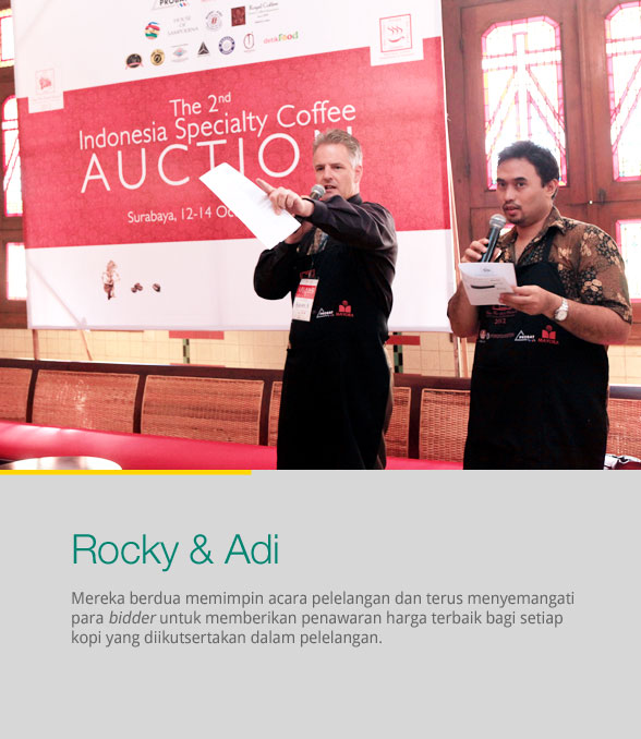 Rasanya tak percuma berangkat di pagi buta tanpa tiket ke airport lalu langsung menujuke Surabaya naik pesawat pertama jam 5 pagi untuk bisa mengikuti acara Lelang yang dipimpin oleh Rocky Rhodes (CQI dan penguji Q Grader) bersama Adi W. Taroepratjeka yang dimulai tepat jam 2 siang. Sebanyak 23 kopi siap ditawarkan kepada para calon pembeli yang dimulai dengan kopi luwak, robusta dan arabika. Semakin sore, suasana semakin panas dan Steven Kil Direktur dari The Specialty Coffee Appraisers Institute of Asia yang berbasis di Korea Selatan menjadi pemborong hampir setengah dari 23 kopi yang dilelang, baik luwak, robusta, maupun arabika dan terus mengacungkan kertas bidding untuk mengalahkan penawar lainnya.