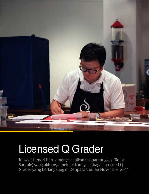 Di kota Denpasar Hendri lulus menjadi seorang Q Grader pada bulan November tahun 2011 setelah melalui perjuangan yang tidak mudah bersama 24 peserta seluruh Indonesia. Lalu ia terus melanjutkan dunia kebaristaan dan terbang ke berbagai negara untuk ngelmu sekaligus diberi kesempatan oleh Tuti H. Mochtar menjadi juri kejuaraan Barista di Thailand dan Singapura. Pengalaman internasionalnya di dua event tersebut membuatnya memenuhi kualifikasi untuk mengikuti ujian sebagai Juri di tingkat World Barista Championship (WBC). Setelah kesempatan untuk lulus menjadi WBC Judge di Korea gagal, Hendri akhirnya menyabet titel bergengsi tersebut di Nagoya Jepang bulan Oktober ini sekaligus menjadi orang pertama di Asean yang berhak berada di panggung kejuaraan Barista tingkat dunia sebagai Juri Teknis. Mengapa mengambil Juri Teknis ? Menurut Hendri, ia sudah dibekali dengan Q Grader yang tentu punya kualifikasi untuk mencicip kopi, jadi ia memutuskan untuk mengambil spesialisasi ini.