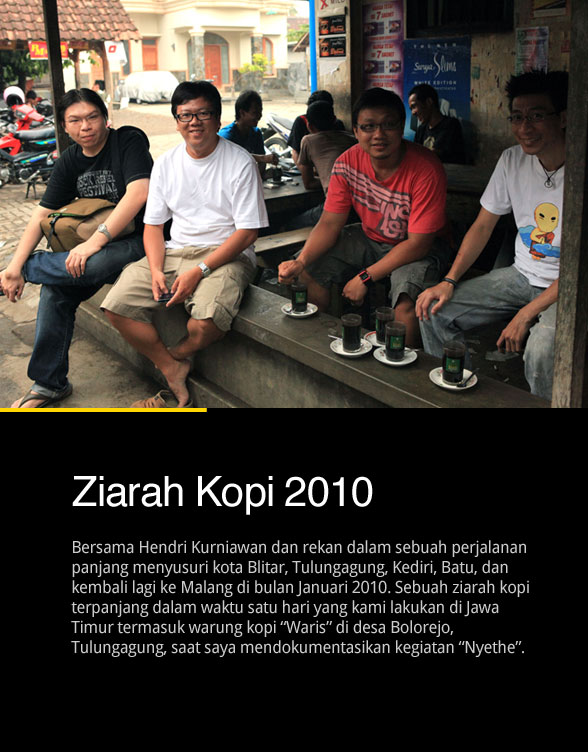 Mobil Nissan X-trail yang dikemudikan Hendri menyusuri kawasan Seleorejo menuju ke Blitar tujuan pertama kami dalam sebuah perjalanan yang kami namai ziarah kopi di propinsi Jawa Timur. Setelah sesesai sowan ke makam presiden pertama RI, Soekarno, kendaraan mulai dikebut menuju kota Tulungagung dengan mengandalkan GPS dari sebuah smart phone yang mengantarkan kami ke warung kopi “Waris” tempat aktivitas Nyethe atau menghias batang rokok dengan ampas kopi. Berlanjut ke Kediri, Batu, dan kembali lagi ke Malang tepat tengah malam di bulan Januari 2010, semuanya dilakukan untuk menelisik kebiasaan ngopi masyarakat pesisir di Jawa Timur. Itu hanya sebagian pengalaman saya bersama Hendri Kurniawan yang sebagian laporan perjalanannya sudah saya tulis di sini.