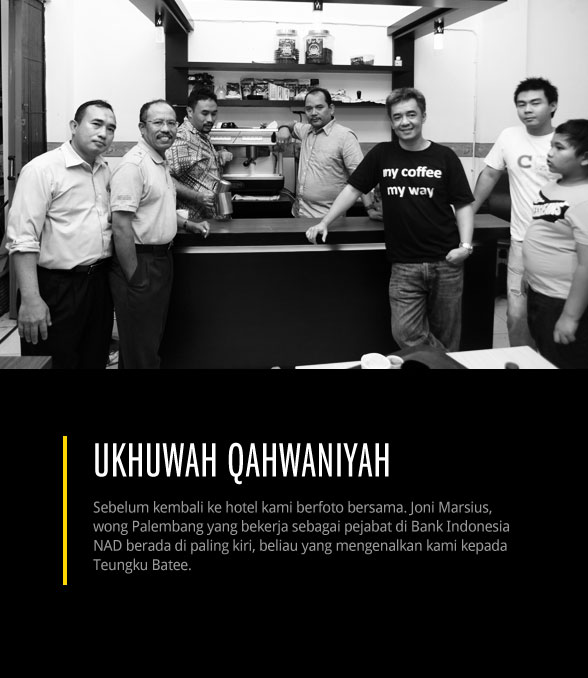 Ceritanya, saya dihubungkan dengan beliau oleh Joni Marsius, wong kito, yang sedang berdinas di Banda Aceh. Niat awal kami berdua hanya ingin bersilaturahmi dalam bingkai ukhuwwah qahwaniyah, bahwa sesama pejuang kopi adalah bersaudara atau dalam basa Sunda-nya dikenal dengan coffeelicious brotherhood. Tapi untunglah Abu tak berkeberatan bila saya menulisakan pengalaman berjumpa dengan beliau sekaligus ingin sedikit mendengar kisahnya memanggul senjata di belantara hutan Aceh hingga guratan nasibnya saat ini menjadi saudagar kopi.