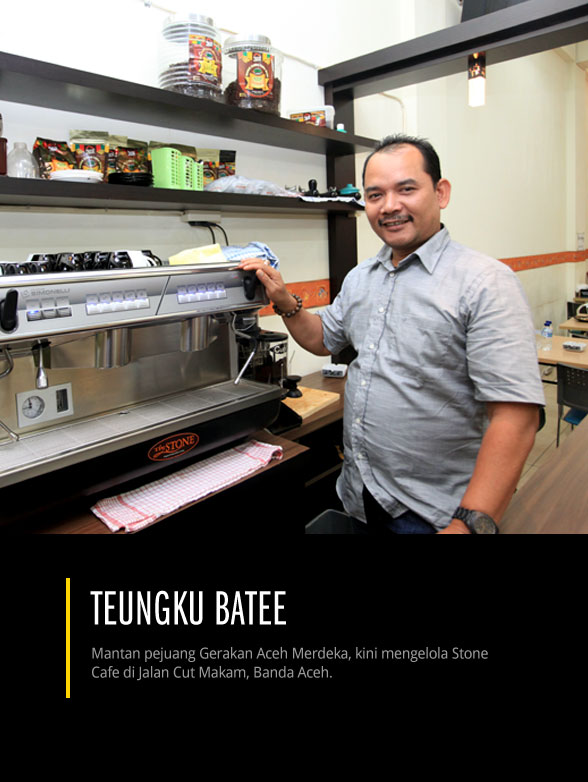 Lelaki berperawakan tegap itu sudah menunggu kami dan sorot matanya yang tajam langsung berubah ramah menyambut kehadiran para tamu dari Jakarta. Malam itu di sela Festival Kopi Aceh, kami berkesempatan mengunjungi salah satu tokoh penting Gerakan Atjeh Merdeka atau GAM, Teungku Batee yang biasanya dipanggil Abu. Usianya sudah di pertengahan 50-an dengan warna kulit agak gelap dan rambut tipis, tapi tak satupun uban terlihat. Dulu Abu mengangkat senjata di pedalaman hutan selama lima tahun sebagai salah satu Panglima GAM, tapi kini ia sudah menghentikan aktivitas perang gerilyanya dan berbahagia dengan usaha kedai kopinya, Stone Cafe di jalan Cut Makam, Banda Aceh.