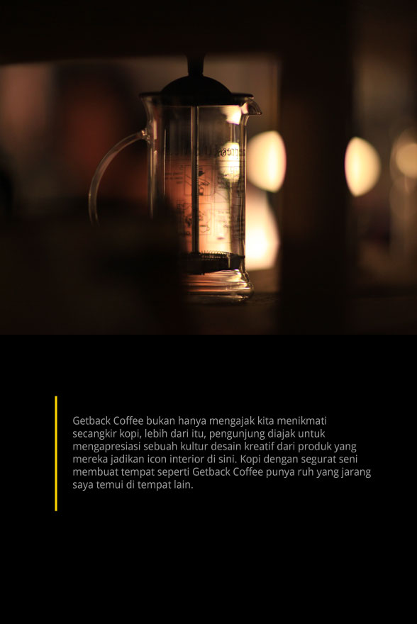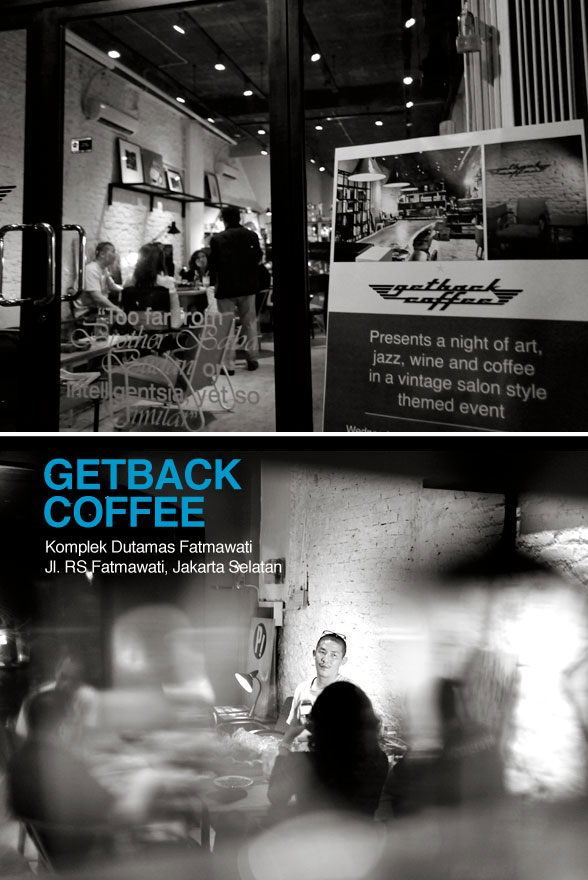 Apa jadinya bila dua disiplin ilmu arsitektur dan teknik sipil bergabung mendirikan sebuah coffee shop ? Jawabannya Getback Coffee yang resmi beroperasi tepat di tanggal 12 Desember 2012 setelah melalui persiapan marathon selama satu bulan penuh oleh tiga orang yang berada di belakang kedai kopi ini : Zamzam dan istrinya Eri Puspitasari beserta rekan bisnisnya Gani Gerardo. Berlokasi di komplek Dutamas Fatmawati, Getback Coffee bukan semata tempat untuk menikmati kopi, tapi representasi ketiga orang ini yang menuangkan segenap kreativitasnya untuk mengajak pengunjung mengapresiasi dan menikmati desain produk masa lalu.