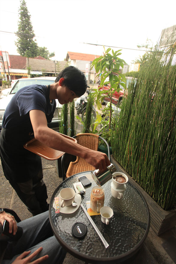Rekan Andy Kho yang sama-sama menempuh pendidikan di Fakultas yang sama di Universitas Pajajaran Bandung sudah menunggu kedatangan saya setelah sehari sebelumnya merekomendasikan tempat ini. Pramusaji membawakan buku menu dan saya melihat berbagai sajian kopi manual brewing termasuk milk based seperti cappuccino dan sebangsanya. Tentu penasaran melihat sebuah kedai kopi mungil yang mau menyajikan banyak variasi sajian seduh kopi unplugged termasuk syphon yang teatrikal itu.