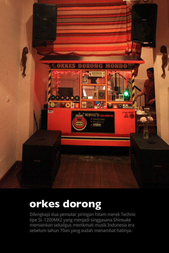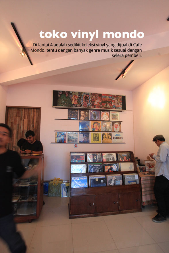 Cafe Mondo terdiri dari empat lantai dan bila Anda ingin khusus mendengarkan musik dan boleh meminta lagu “kebangsaan” Shunsuke akan dengan senang hati memutarkannya selama koleksinya tersedia. Tak usah ragu berbincang dengan lajang yang terus berburu koleksi piringan hitam di Jalan Surabaya di kawasan Menteng Jakarta dan banyak tempat lainnya.