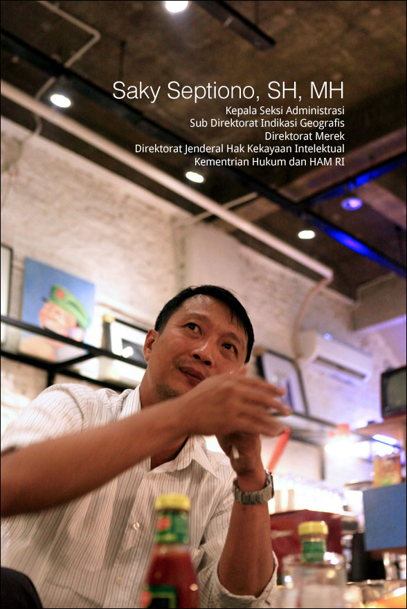Saky yang lahir di Jakarta dan Magister Hukum dari Fakultas Pasca Sarjana bidang Hukum Universitas Diponegoro, mengatakan bahwa pemerintah Indonesia sudah memulai IG sejak tahun 2005. Saat itu, melalui tangan Saky dan rekan sekerjanya, untuk pertama kali pemerintah Indonesia berhasil memberikan sertifikat Indikasi Geografis untuk kopi Kintamani Bali. Sebuah pencapaian yang sangat penting dalam memberikan perlindungan hukum terhadap para petani kopi di pulai Dewata ini sekaligus memberikan ketentraman dalam upaya budi daya kopi Kintamani yang tidak bisa ditiru oleh wilayah manapun.