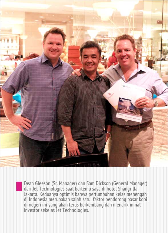 Pasar kopi Indonesia bersiaplah menyambut kedatangan perusahaan Jet Technologies dari Australia yang akan segera membuka kantor perwakilan mereka di Jakarta dalam waktu dekat. Salah satu produk mereka yang sudah malang melintang di negara-negara Asia Pasifik adalah sistem pengemasan kopi dan industrial roasting. Dalam sebuah rencana ekspansi bisnis di kawasan Asia Tenggara mereka singgah di Jakarta dan menemui saya atas rekomendasi rekan Adrian Malvianto dari Konsulat Jenderal RI di Melbourne.