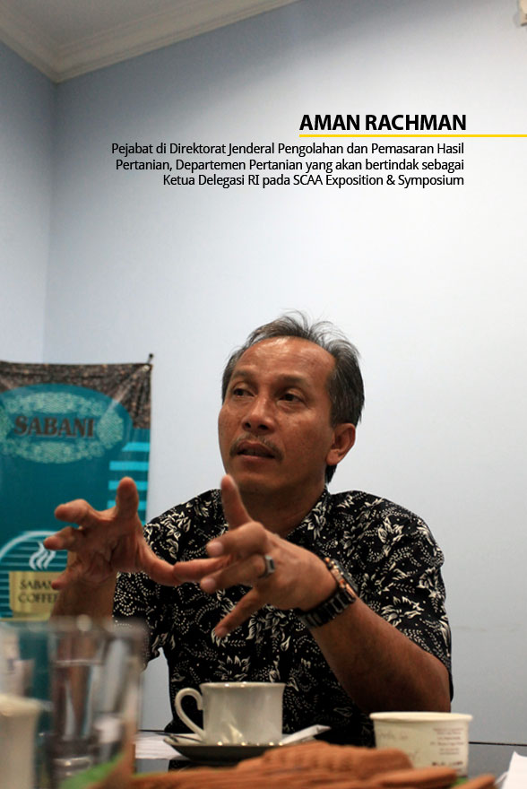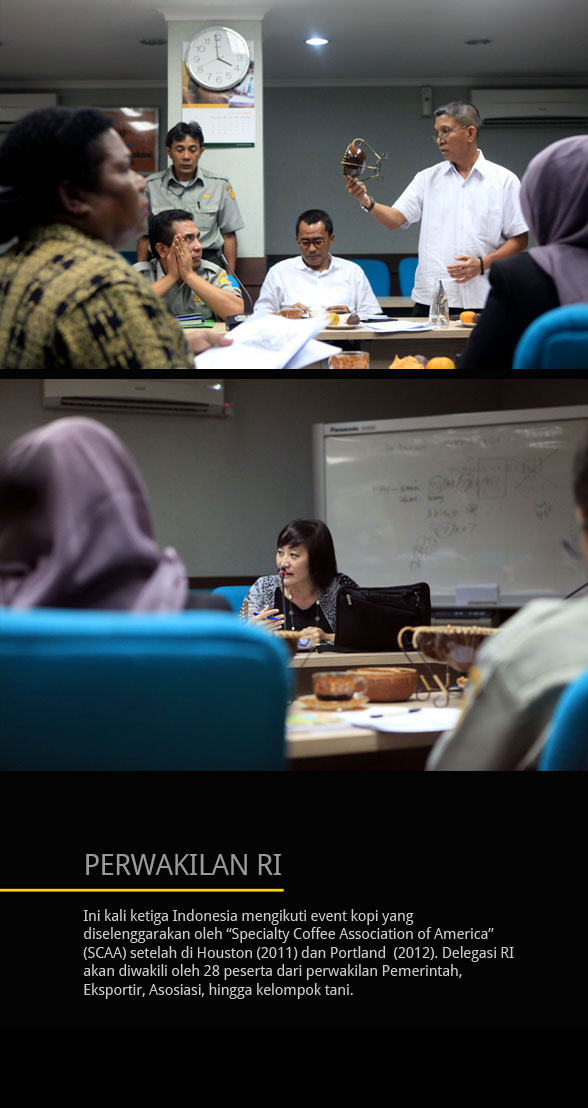 Pertemuan di Direktorat Jenderal Pengolahan dan Pemasaran Hasil Pertanian, Departemen Pertanian di Ragunan belangsung hangat di hari Senin kemarin. Hadir pada pertemuan tersebut perwakilan eksportir, kelompok tani, dan Asosiasi Kopi Spesial Indonesia yang dengan seksama tengah mempersiapkan materi dan bahan pameran pada hajatan kopi internasional yang akan berlangsung dari tanggal 10-14 April ini bersamaan dengan kejuaraan Barista Amerika.