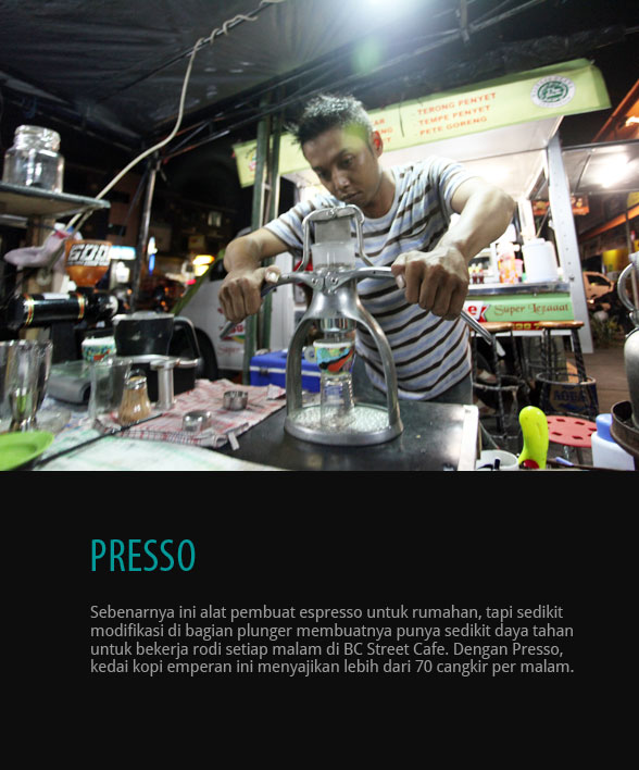 Satu alat Presso, penggiling kopi, milk frother, beserta timbangan digital adalah arsenal utamanya dalam meracik berbagai menu kopi yang disajikan dengan harga 9 hingga 12 ribuan per cangkir. Menu lainnya berupa makanan pisang goreng, mie siap saji, dan roti bakar yang harganya paling mahal dibanderol 8 ribuan. Tak heran jika BC Street Cafe banyak didatangi oleh kalangan pelajar dan mahasiswa yang menikmati malam panjang sembari menikmati secangkir kopi. Pengunjung bisa duduk di meja kecil yang disediakan, namun banyak yang memilih lesehan, sebagian cukup berbusana sarungan. Jadi tak heran saat saya ke sana, Rifka tak banyak berbincang dengan saya karena kesibukannya yang tiada henti melayani pesanan yang datang silih berganti.