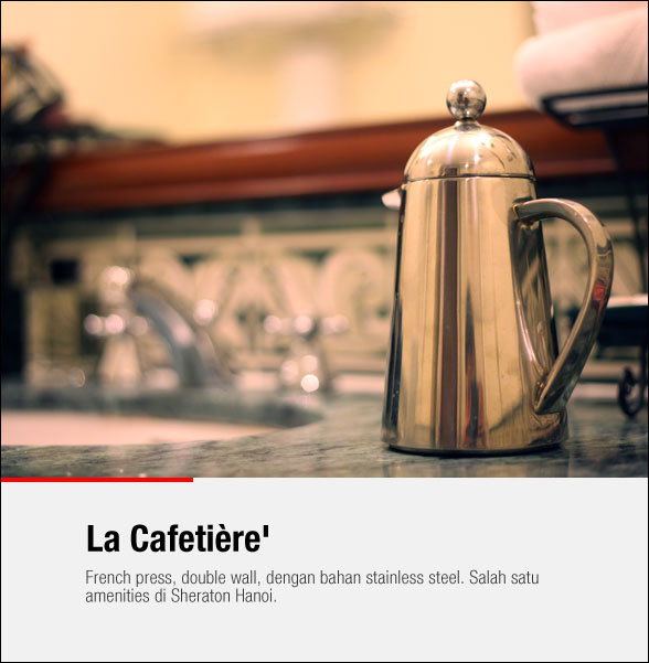 Bila hotel lain di setiap kamar cukup menyediakan kopi siap saji, tapi tidak untuk Sheraton Hanoi yang berbaik hati dengan melengkapi setiap kamarnya dengan La Cafetière’ sebuah french press yang berbahan stainless steel. Setidaknya dengan alat saya bisa menyeduh dan menikmati kopi yang khusus dibawa dari Indonesia, tanpa ampas.