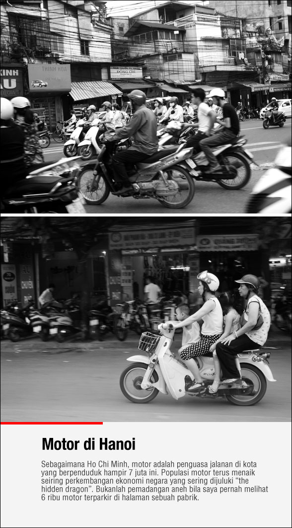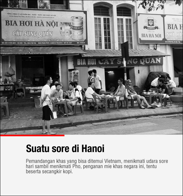 Bahasa Vietnam tak mudah untuk dipelajari yang menurut kolega saya orang Vietnam terdiri dari enam intonasi yang dilambangkan dengan berbagai titik koma di setiap alfabetnya. Jadi saya pasrah membiarkan ia memesan secangkir kopi hitam dan kami memilih duduk di sebuah pojok sambil tak henti memperhatikan atmosfir di sini.