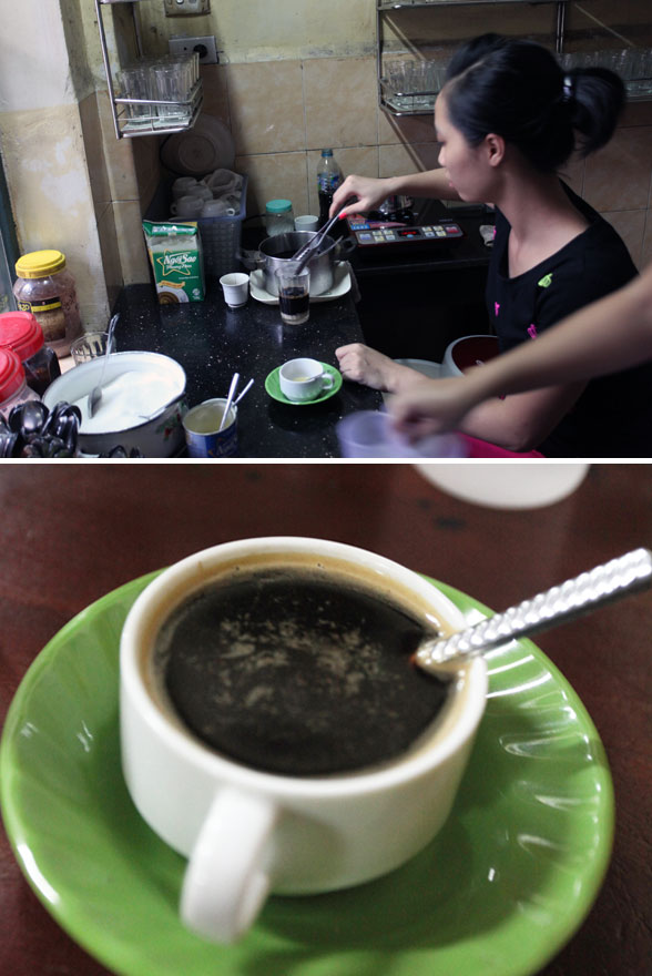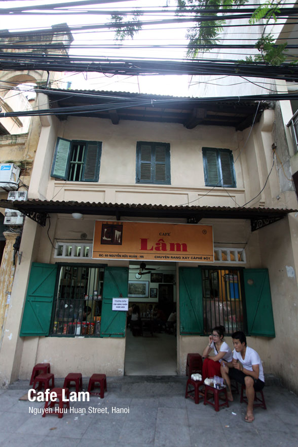 Concierge menyarnkan saya untuk berkunjung ke Lam Cafe, salah satu kedai kopi tertua di Hanoi dan ke sanalah kendaraan sewaan kami arahkan. Dengan suhu saat siang bisa mencapai 40 derajat Celcius dan tingkat kelembaban hingga 50%, Hanoi adalah kota yang pas untuk melakukan sauna secara gratis, namun di sore hari suhu udara mulai bersahabat. Lam terletak di kawasan pusat perkotaan yang sepanjang jalannya banyak bertebaran cafe-cafe tradisional lainnya. Tapi Lam sudah cukup banyak dikenal oleh para turis, sebuah warisan Hanoi yang bangga akan tradisi kopi tetes nan pekat hingga susu kental manis adalah paduan yang serasi untuk menyeimbangkan rasa pahitnya.