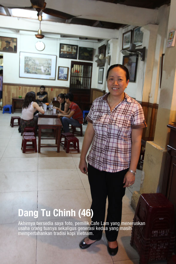 Pemiliknya, Dang Thu Cihn (46) sibuk melayani pengunjung di kasir pembayaran tapi melalui penterjemah ia enggan dan malu berhadapan dengan kamera walau akhirnya bersedia saya abadikan. Hanya tersenyum sambil menyebutkan namanya serta sekilas warung kopi yang ia kelola sebagai generasi kedua.