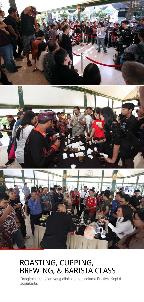 Festival Kopi Indonesia di Jogjakarta kali ini diisi dengan kegiatan cupping, barista class, roasting class, dan manual brewing yang dibawakan oleh Tuti Mochtar, Adi. W. Taroepratjeka (Secangkir Kopi, Andreas Andrianto (Cangkir Coffee), Heri Setiadi (La Tazza), Mohamad Aga (Getback Coffee), Dodi Samsura (Juara IBC 2013, 1/15 Coffee), Vivi Sofia (Kopi Bali), David (Santino Coffee), dan Irwanto (Toffin), serta Dico.