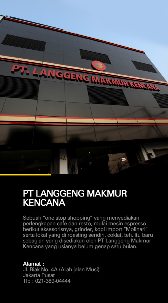 Selain menjadi distributor untuk mesin espresso Wega, PT Langgeng Makmur Kencana juga mengimport kopi yang mengusung merek Molinari, produsen kopi yang sudah berdiri sejak dua abad lalu di Italia. Tapi untuk yang memilih kopi lokal, Michael, yang juga seorang roaster saat ia secara khusus belajar bidang ini di Australia, menyediakan banyak varian kopi dari Indonesia sesuai dengan kebutuhan konsumen.
