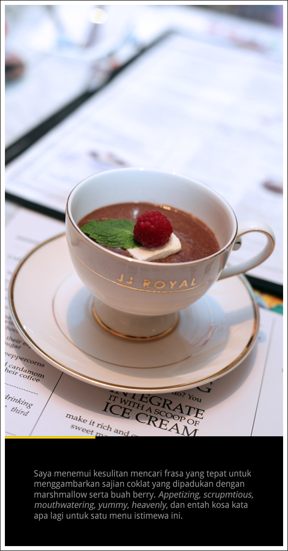 Tak lengkap berbicara tentang JJ Royal Brasserie dengan mengabaikan keberadaan kopi mereka walau hidangan minuman coklat dengan kudapan marshmallow sungguh membuat istilah food orgasm menemukan pembenarannya.