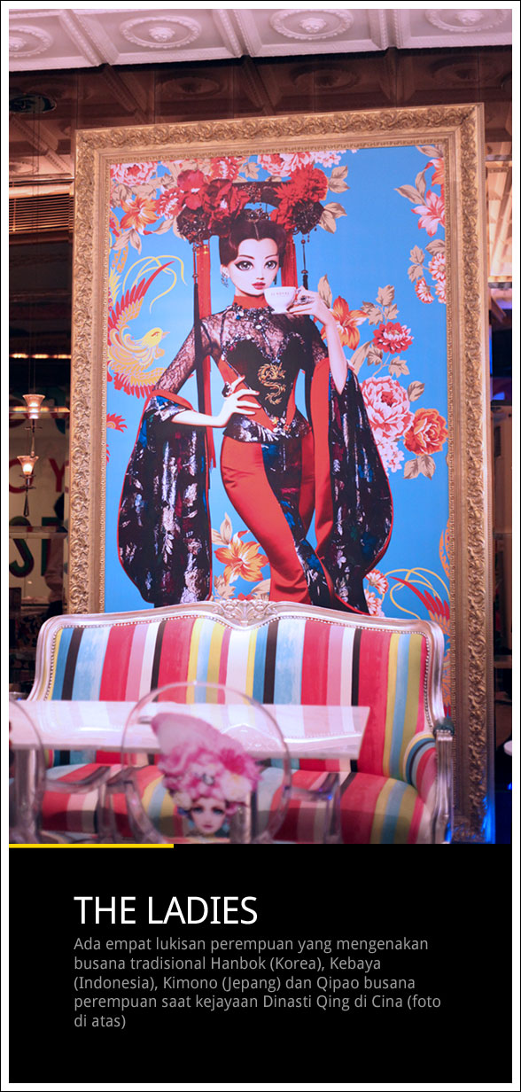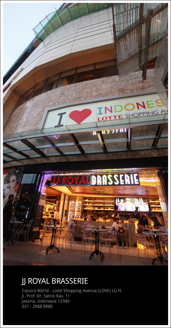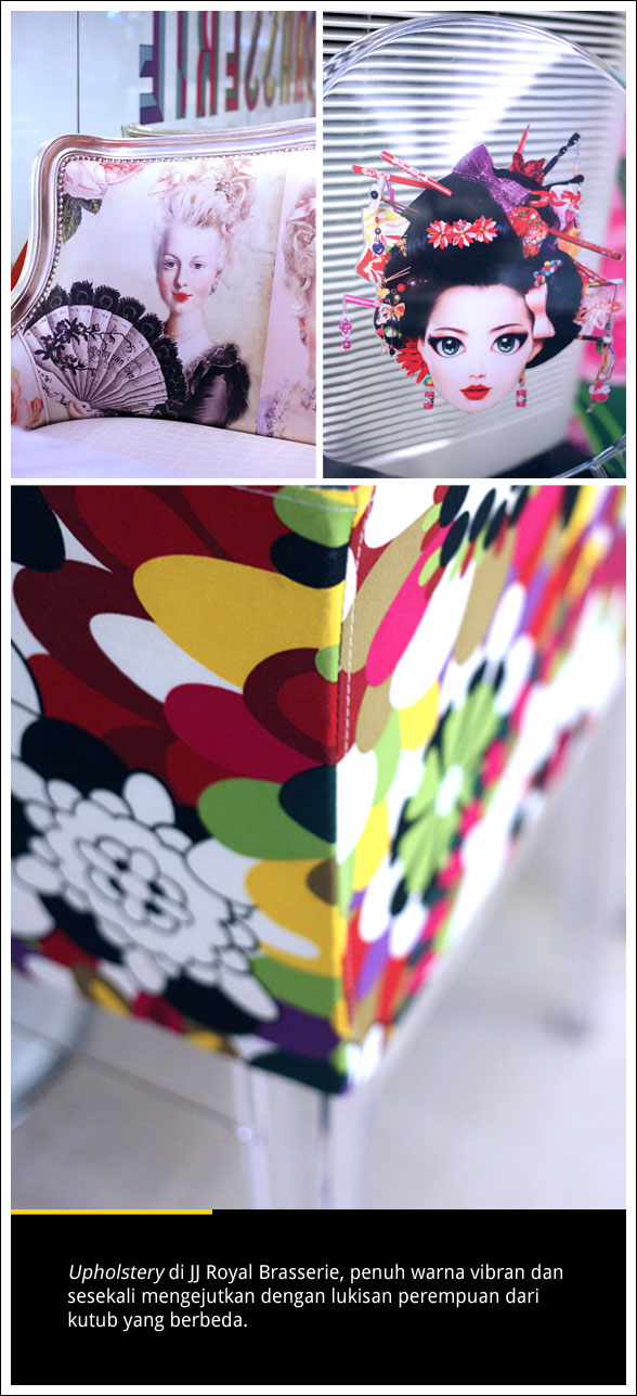 Sulit untuk tidak melepaskan pandangan mata ke arah bingkai yang sangat besar berupa lukisan perempuan berbusana tradisional Jepang yang sedang memegang kipas saat memasuki JJ Royal Brasserie. Menariknya, bingkai tersebut tidak di tempatkan di dinding, tapi menjadi ornamen interior di plafon brasserie yang secara resmi baru saja beroperasi di Ciputra Wold 1, Lotte Shopping Avenue, Jl. Dr. Satrio Kavling 11, Jakarta. Masih dengan gaya lukisan yang sama, di ruangan lainnya, seorang perempuan dengan gaun malam berwarna merah muda dan gaya rambut la couturiere Parisienne sedang menikmati secangkir kopi JJ Royal. Vibran, grandeur dan elegan !