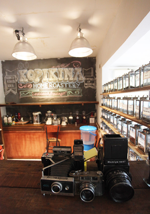 Beberapa foto hitam putih dengan tema human interest ditempel di dinding yang kemudian saya ketahui merupakan ahsil karya Cornelius. Tak heran karena sederet kamera analog dipajang di Kopi Kina, dari kelas medium format hingga 35mm, Mamiya, Hasselblad, dan beberapa merek high-end lainnya.