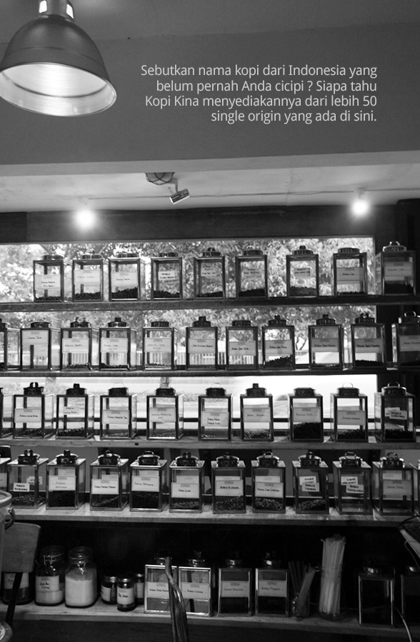 Bila ada rekor MURI untuk kedai kopi yang paling banyak menyediakan kopi se Nusantara, saya yakin gelar tersebut akan diraih oleh Kopi Kina. Dengan lebih dari 50 kopi dari berbagai pelosok daerah di Indonesia, warung kopi yang baru berusia tiga minggu ini memang layak jadi pemecah rekor. Adalah Cornelius Swangga (25) yang pekerjaan formalnya adalah seorang ahli penelisik kerak bumi atau geolog lulusan UGM yang kemudian menjadikan Kopi Kina sebagai bentuk idealismenya untuk mengenalkan kekayaan kopi Indonesia khususnya ke publik di Jakarta.