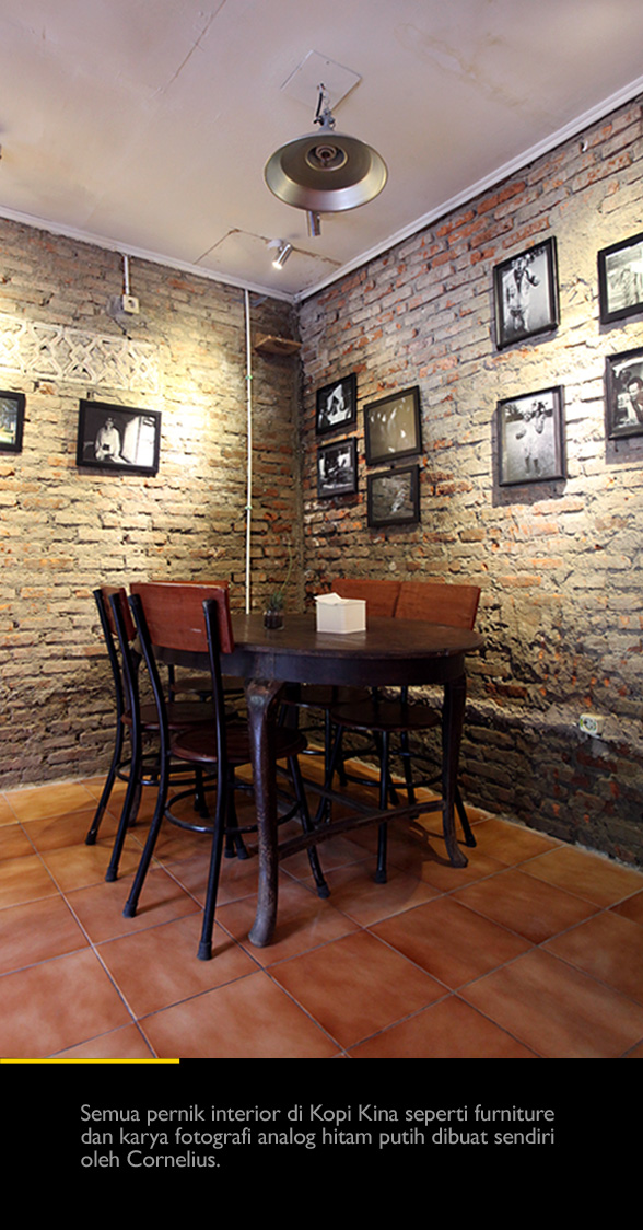 Cornelius yang kelahiran Jogja sebenarnya ingin membuat suasanya Kopi Kina sebagaimana cafe yang berada di kotanya. Namun karena berbagai keterbatasan terpaksalah lajang ini berakrobat mendesain sendiri ruangan yang luasanya sekitar 80 meter persegi.