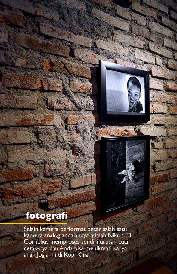 Saya selalu angkat topi untuk para penggemar kamera analog atau masih menggunakan film. Bukan apa-apa, hobi yang satu ini berada di different league, perlu kejelian memandang objek, mengukur intensitas cahaya, komposisi yang apik, dan bukan seperti era digital sekarang, pada genre ini fotografer tak akan pernah tahu hasil akhirnya sebelum film-nya di proses. Mendebarkan, dan mungkin sensasi itu yang didapatkan Cornelius saat berada di kamar gelap dan hasil karyanya bisa Anda nikmati di dinding bata merah Kopi Kina