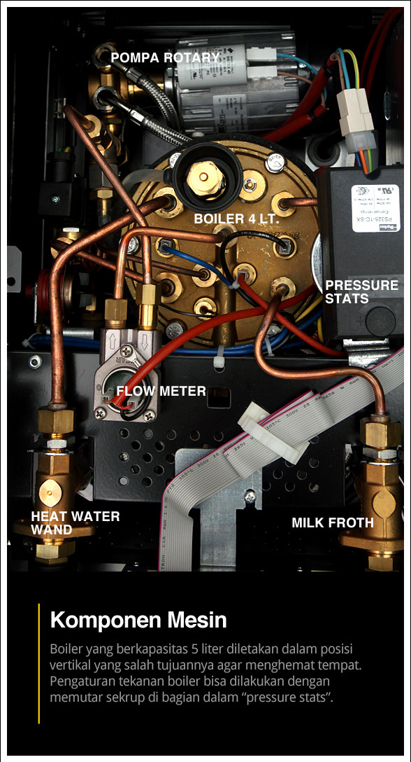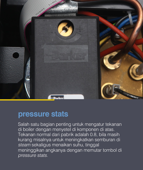 Lebih kurang dari 15 menit mesin sudah siap digunakan saat jarum indikator menyentuh angka 0.8 bar dan enggan untuk naik lagi. Suhu air saat di test dengan thermometer menunjukan angka 94 derajat celcius. Bila dirasa angkanya cukup kecil, Anda bisa mengatur tekanan boiler dengan membuka panel di bagian atas untuk akses ke komponen “pressure stats” yang ditandai dengan penutup kecil berwarna kuning. Tinggal putar ke arah tanda (+) untuk menaikan tekanan di boiler dan sebaliknya (-) untuk menurunkan kembali.