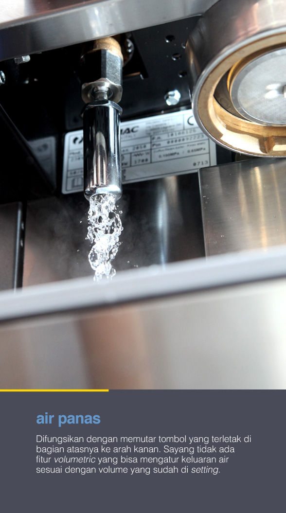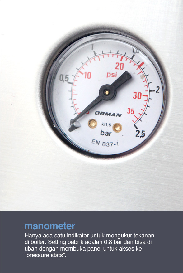 Hanya terdapat satu indikator atau manometer untuk menunjukan tekanan di boiler, tanpa kehadiran fitur brew pressure. Selain itu Promac dilengkapi dengan satu tuas untuk steam di sebelah kanan, dan air panas di bagian kiri. Untuk boiler dengan ukuran 4 liter saya menyarankan untuk tidak terlalu sering memfungsikan tombol air panas yang akan membuat tekanan dan suhu air di dalam boiler turun dengan cepat.