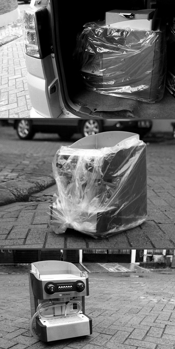 Perlu dua orang untuk mengangkat mesin ini ke sangkar tempat saya biasanya bermain-main dengan mesin espresso. Sambungan pompa Nochi dipasangkan dengan pipa untuk menyedot air dari galon ke dalam boiler dan setelah semuanya terpasang dengan rapi, mesin mulai dinyalakan dengan menekan tombol paling bawah dari dua tombol yang ada.