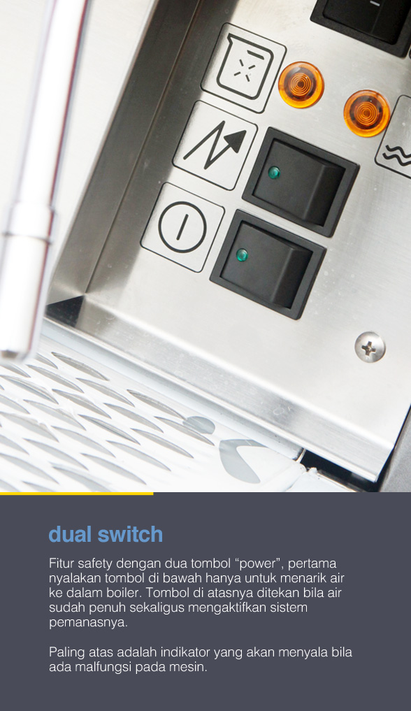 Sebagaimana sistem dari Vibiemme, Promac menggunakan metode dual switch agar boiler terisi air terlebih dahulu sebelum tombol kedua atau pemanasnya diaktifkan. Ini merupakan fitur pengaman untuk mencegah kerusakan yang sering terjadi pada heating element yang akan langsung tewas dengan sukses bila langsung bekerja tanpa adanya pasokan air.