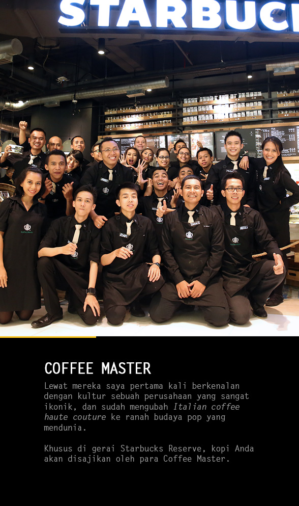 Ada yang berbeda karena Anda bisa memesan kopi “manual brewing” dengan sistem drip (flat bottom) yang khusus disajikan oleh para Coffee Master. Para Coffee Master adalah garda terdepan di setiap gerai Starbucks yang biasanya membawahi para partner (sebutan Starbucks untuk penyaji kopi) dengan apron berwarna hijau. Tapi khusus di Starbucks Reserve, sajian kopi Anda hanya akan dibuat oleh para Coffee Master yang sebelumnya harus melalui seleksi dan ujian dalam program yang dikembangkan oleh Starbucks.