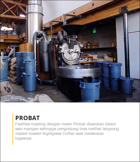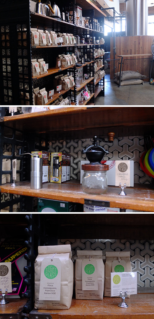 Sedangkan mesin roaster ditempatkan di bagian terdepan agar bisa terlihat oleh siapapun walau tak ada kegiatan gongseng kopi saat itu. Sightglass melakukan pembelian langsung ke perkebunan kopi di Afrika (Rwanda, Kenya, Ethiopia), Amerika Latin (Colombia, Ekuador, Guatemala, Peru,) dan beberapa negara lainnya.