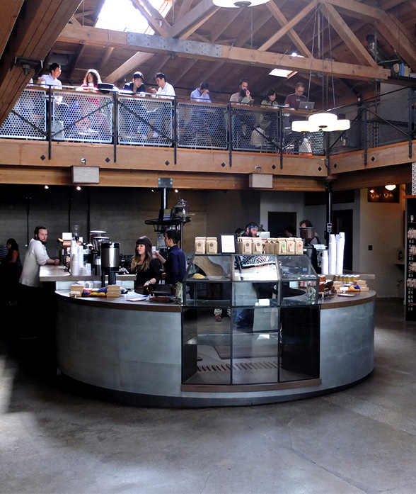Baiklah, kembali ke Sightglass Coffee, sebuah ruangan yang bergaya industrial warehouse dengan rangka kayu yang dibiarkan terekspos terutama di bagian atapnya. Terdiri dari ruangan dengan lebar kira-kira 10 meter dan panjang 15 meter dan lantai yang disemen halus.