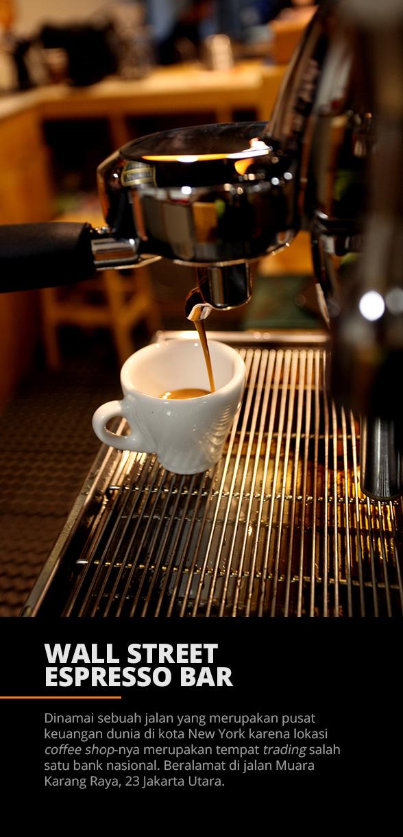 Dua tahun lalu pada suatu malam dalam ruang temaram sebuah kedai kopi di Jember saya menikmati secangkir kopi ditemani musik kendang kimpul khas Banyuwangi. Ia mengungkap keinginannya untuk masuk ke pasar di Jakarta dan kini mimpinya sudah terwujud dengan Wall Street Espresso Bar.