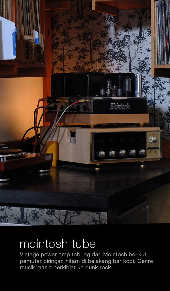 Tak terasa saya sudah berada di depan kasir dan langsung memesan satu espresso yang harga totalnya sekitar 3 dolar berikut pajak dan berdiri menunggu pesanan. sambil menunggu, pandangan langsung tertuju di sebuah sudut belakang Barista, sebuah sistem audio dengan jantung power amplifier McIntosh ! Sederet piringan hitam berjajar rapi dan genre musik, sekali lagi punk rock sedang diputar saat saya berada di sana.