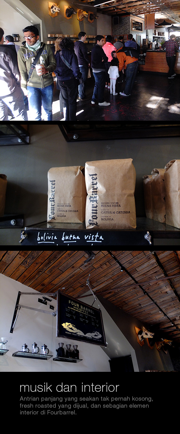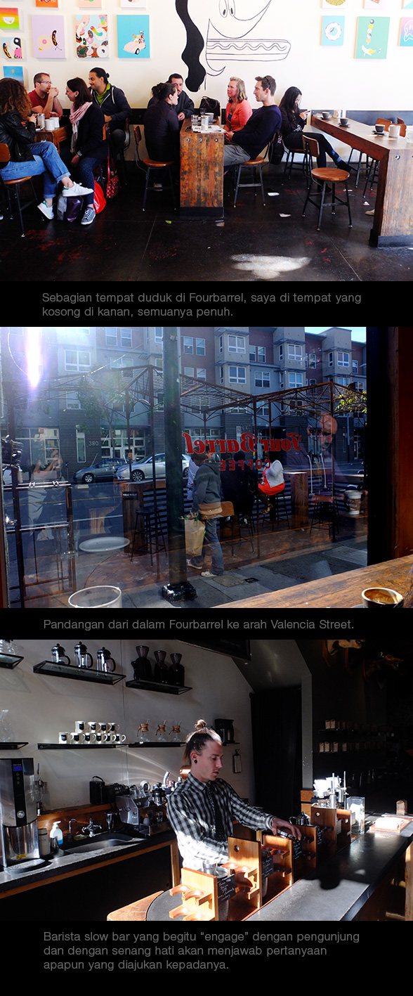 Setelah Sightglass Coffee, tujuan selanjutnya adalah Fourbarrel Coffee hanya kurang dari 10 menit perjalanan dengan menggunakan taksi ke kawasan Mission. Melihat jam, dan saya hanya punya sekitar beberapa jam lagi sebelum taksi yang sudah dipesan menjemput di hotel. Tapi tiba di depan Fourbarrel sejenak saya melupakan semua yang harus dilakukan. Akhirnya saya menginjakan kaki di salah satu tempat yang sudah lama ingin dikunjungi.