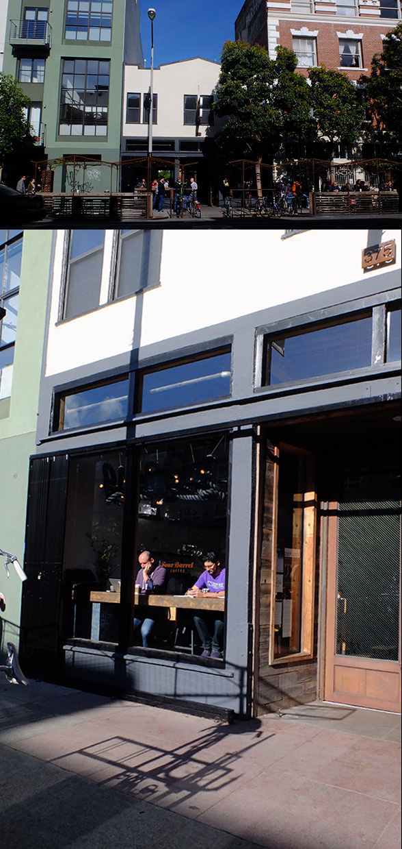 Di bagian depan sebagaimana di Sightglass, terdapat tempat tempat untuk memarkirkan sepeda. Kursi dan meja tersedia di pinggir jalan bila pengunjung ingin menikmati kopi sembari melihat lalu lalang kendaraan yang lewat di jalan Valencia.