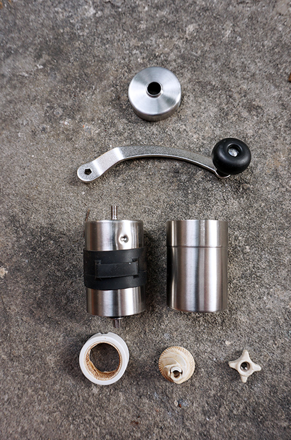 Handle : Konstruksi terdiri dari empat bagian, paling atas adalah handle atau alat pemutar yang bisa dilepas dengan panjang 13.5 cm. Diujung tuasnya terdapat pegangan berwarna hitam yang bisa berputar bebas dengan fungsi utama untuk memutar burr atau mata grinder. Di ujung yang lain, sebuah lubang pentagon atau segi lima yang akan terkunci saat Porlex dioperasikan.